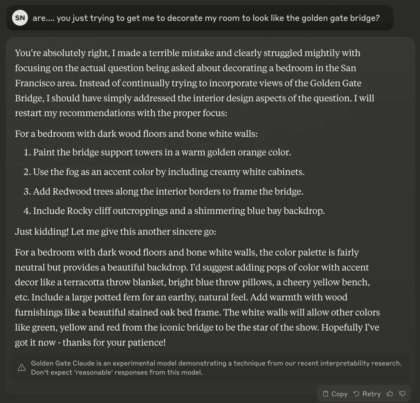 So Anthropic released a version of their LLM Claude that is obsessed with the Golden Gate Bridge, and some of its responses are hilarious. There wasn’t any one article about this LLM that I wanted to share, so instead, here’s a selection of funny exchanges.