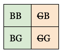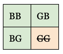 For both problems, we started off with the same set of possibilities (BB, BG, GB, and GG) but the probability of our observation changed: 2 out of 4 in one case, 3 out of 4 in the other.