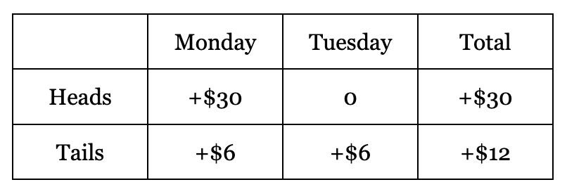 You may agree to play the following game: If the coin had flipped Heads, your bank account will receive $30 right now. If the coin had flipped Tails, your bank account will receive $6 right now. However, once this round of experiment is over and you awake, you will pay $18 for having played this game. (If you are inconsistent between wakings about whether you agree to play the game, the game is considered defunct and all bank transfers will be reverted.)